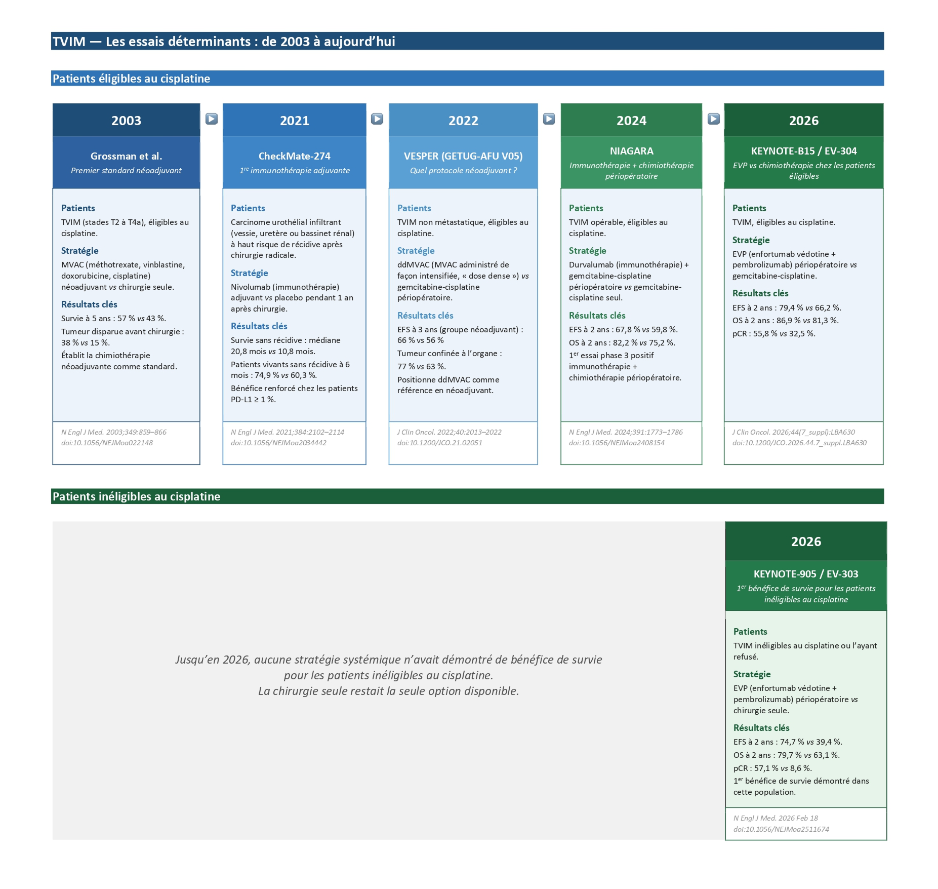 Avec un bénéfice de survie significatif et un taux de réponse pathologique complète d’environ 57 % — très supérieur à ce qu’on observait historiquement — cette étude redéfinit-elle le standard péri-opératoire des TVIM inéligibles au cisplatine, et qu’est-ce que cela change concrètement en pratique ?