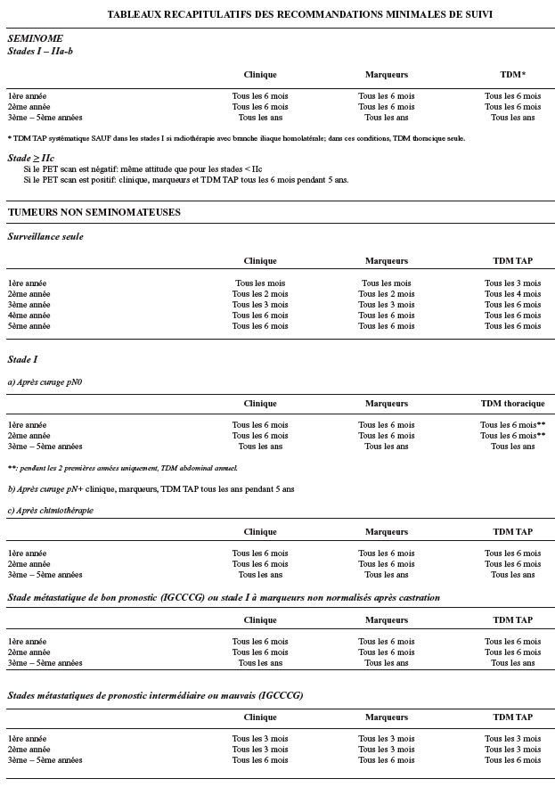 Après un curage négatif, la surveillance comprendra un examen clinique, le dosage des marqueurs sériques, un scanner abdominal tous les ans uniquement les 2 premières années, un scanner thoracique tous les 6 mois pendant 2 ans, puis tous les ans jusqu’à la cinquième année.
