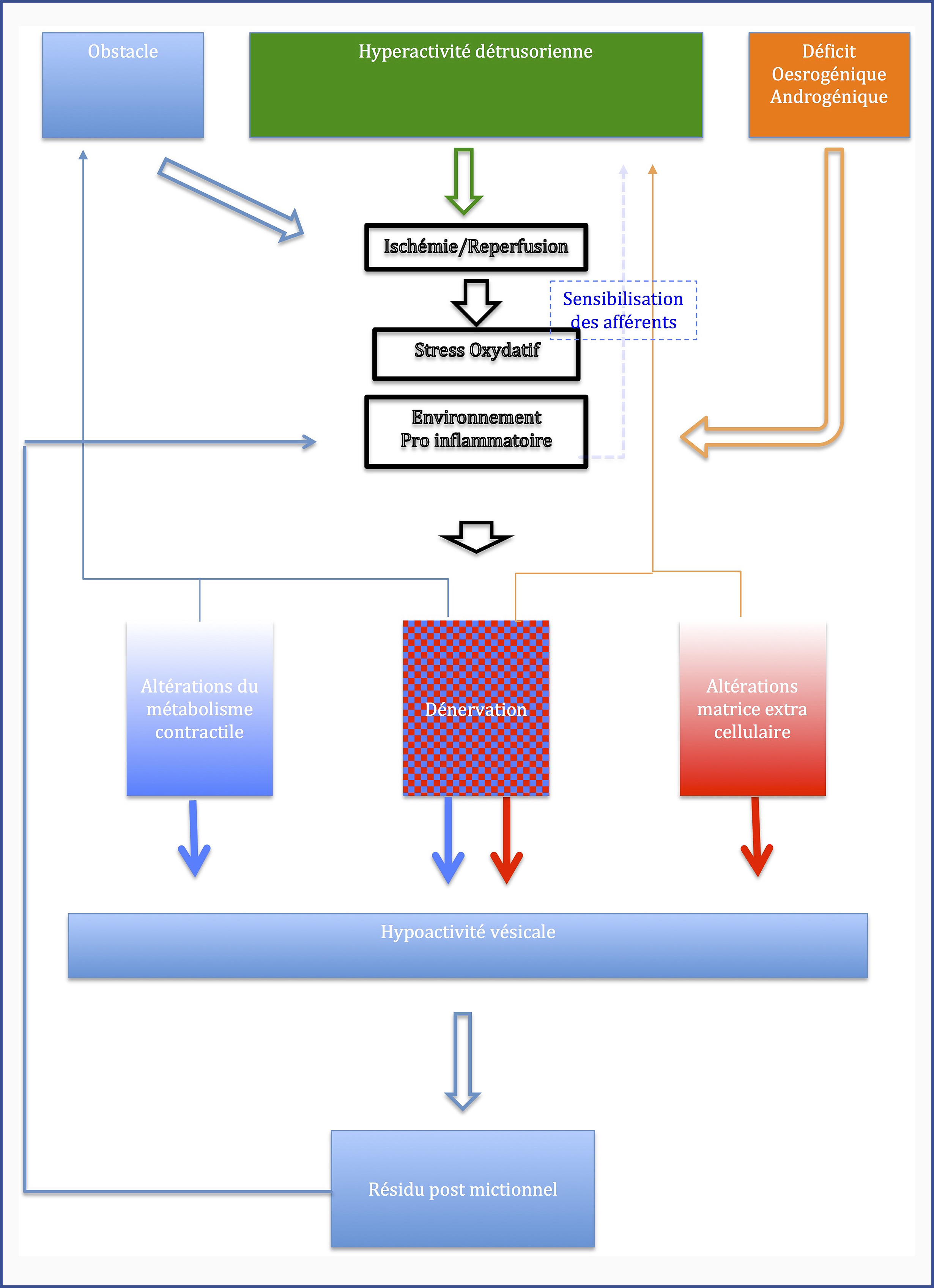 Cliquez ici pour aller à la section Références], l’efficience (amplitude et durée) et la désynchronisation de l’activité contractile lors de la phase mictionnelle pourraient constituer des substrats pour une hypocontractilité présente dès les premiers stades évolutifs de toute hyperactivité détrusorienne et indépendamment du contexte étiopathogénique. Un autre mécanisme causal d’hypocontractilité chez le sujet âgé hyperactif est fourni par l’ischémie chronique. Ainsi, le cycle alterné de hautes pressions générées par l’hyperactivité détrusorienne et de relaxations associées ou non à une fuite crée les conditions parfaites d’un état d’ischémie reperfusion avec production de radicaux libres (cf Figure 1). Plusieurs arguments renforcent l’hypothèse que la sévérité de l’ischémie chronique constitue un paramètre critique pour le passage d’un tableau d’hyperactivité détrusorienne isolée à une hyperactivité détrusorienne avec hypocontractilité détrusorienne.